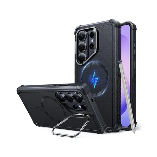 This tough magnetic phone case is designed for the Samsung Galaxy S26 Ultra. It features shock-absorbing Air Guard corners and a durable three-layer construction, exceeding military standards with up to 23 ft (7 m) drop resistance for all-around protection. Built-in magnets deliver 1,500 g of magnetic strength for a secure hold and seamless MagSafe charging. A premium zinc-alloy dual-mode stand provides stable, adjustable viewing angles for work or entertainment without interfering with magnetic charging or accessories.